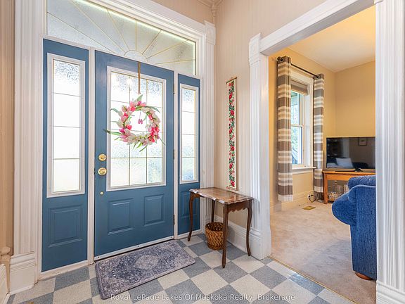 Beautifully maintained historic home with all of the amenities you are looking for. Proudly positioned on its double municipally serviced lot with its quintessential covered porch giving it a look of grandeur not often found in current day homes, especially in this price range. This historic 4 - 5 bedroom, 2 bathroom residence has retained the integrity of its original build with high white painted wood ceilings, corner piece original trim and custom lathed baseboard, built-ins, wooden doors with metal handles, and wood banisters with hand crafted newel posts. Blending timeless craftsmanship with modern convenience, this well-built home offers peace of mind thanks to updates like vinyl siding, municipal services, a durable steel roof, and more. From the driveway side there is a large 3 season sunroom which could be updated to create a 4 season family room. The kitchen is sunlit and offers ample cabinets with adjacent main level laundry and 3 piece bathroom close by with access to the garden patio and barbecue. The dining room is ideal for family and friend gatherings and the living room is airy and bright. A cozy main-level bedroom is located near the back door, overlooking the yard and Yonge Street, perfect as a guest room or a home office. Upstairs, you'll find four additional bedrooms and a spacious 4-piece bathroom.This residence offers all of the amenities of modern life, with an efficient forced air gas furnace, top-of-the-line black tile steel roof which was installed in 2019 and has a transferable warranty, basement for storage, and a bonus detached double car garage nestled back from the road with siding replaced in 2013 and roof done in 2015. A truly one-of-a-kind home, ready to offer years of cherished memories for its next family. Annual costs are reasonable gas $1,368.00, hydro $1,236.00, water heater rental $300.00, water/sewer $1,098.00.