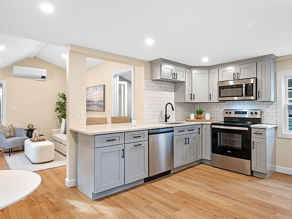 Completely gut-renovated to the studs in 2023, this penthouse duplex condo features modern high-end finishes. The open concept kitchen and living area with vaulted ceilings is perfect for entertaining and everyday living. Kitchen boasts sleek cabinetry, quartz countertops with a breakfast bar, stainless steel appliances, tile backsplash, large undermount sink with disposal, dishwasher and microwave. The bathroom features a tiled floor and shower surround, full tub, and matching quartz vanity separated by pocket door. Efficient, smart mini-split heating and cooling. The building was fully insulated for energy efficiency. Additional highlights include washer and dryer in the unit, a shared patio, yard and storage shed. Budget-friendly HOA fee covers snow removal, landscaping, water/sewer, and master insurance. Pet friendly. Located just 0.7 miles from downtown Salem and Commuter Rail, and right next to Mack Park, this home provides easy access to all that Salem has to offer!