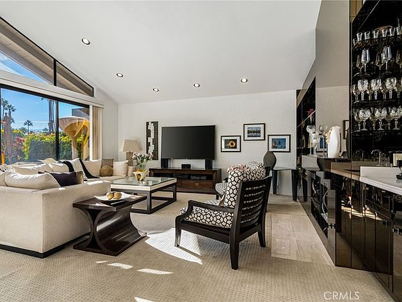 The expansive great room, impeccably furnished with Kreiss furniture and accented by smoky mirrors, sets a sophisticated, dreamlike ambiance. The kitchen has been thoughtfully opened to the living space and features granite countertops, stainless steel appliances, and a generous bar top with seating for six—perfect for casual mornings or evenings spent entertaining. A defined dining space lends itself to lingering dinner party guests.