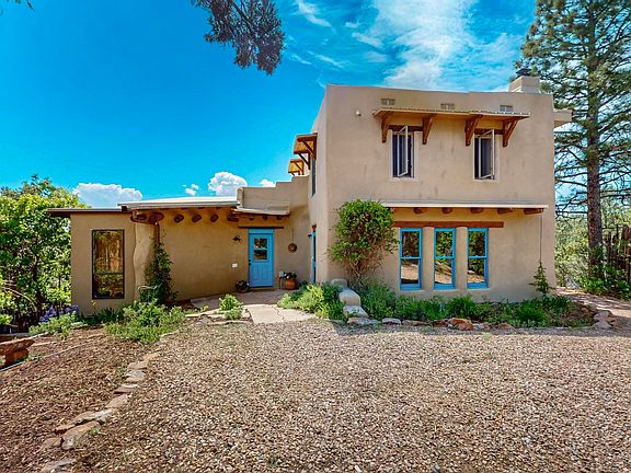 Two houses reside on this beautiful 5 Acre property that is nestled among old growth pine trees, offering numerous possibilities and conveniently located about 20 minutes from town The property features two distinct homes and a studio/workshop, all within a peaceful natural environment. House #A includes 2 bedrooms, 1 bath, fireplace, stained concrete floors, hard trowel plaster walls, radiant heat, a loft, and vigas, and a private deck. House #B known as the "Lily Pad House" offers 3 bedrooms, 2 baths, fireplace, saltillo tiles, vigas, radiant heat, hard trowel plaster, wood floors, vigas, spacious kitchen, portal, and delightful koi pond with lilies. Additionally, there is a versatile studio/workshop, consisting of an enclosed vintage travel trailer perfect for guests, and an attached site-built studio/workshop, providing multiple potential uses. The property also benefits from a private well, storage sheds, and no Homeowners Association.