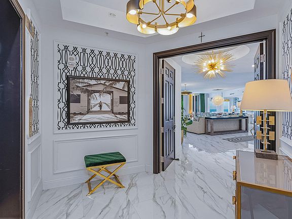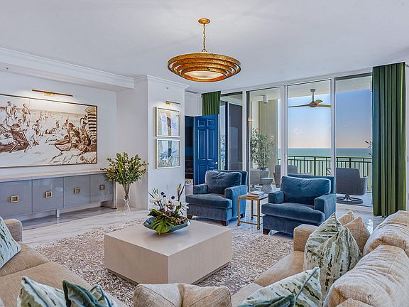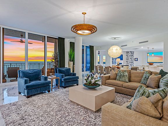 Perched above the shimmering shoreline at the southern tip of Marco Island, this extraordinary Penthouse at Belize in Cape Marco is a rare coastal masterpiece where breathtaking panoramas, magazine-worthy renovation, and ultra-luxury resort living converge in spectacular fashion. From the moment the elevator opens into your private foyer, sweeping Gulf, beach, and island views pour in, setting an unforgettable tone for a residence designed to awe at every turn. Italian porcelain floors flow through a brilliantly reimagined interior that blends warm coastal elegance with sophisticated style, beginning in the welcoming Grand Salon, where walls of glass frame dolphins at play, boats drifting across turquoise waters, and vibrant sunsets painting the sky each evening. The chef's kitchen impresses with abundant white cabinetry, sunlit counter space, an expansive island, and seamless connection to both casual and formal living areas. A newer stainless steel GE double-wall oven enhances the already exceptional culinary experience, complementing the home's refined coastal design. The adjacent Gulf-front den with fireplace creates an intimate waterside retreat for morning coffee or quiet evenings. A separate media room—also with a fireplace and dramatic picture windows—adds another inspired living space, while the beautifully appointed office with a wet bar, wine cooler, and lanai access perfectly balances productivity and relaxation.The primary suite is a sanctuary of serenity, where a full wall of glass opens to endless horizon views, complemented by dual walk-in closets including a cedar-lined closet, a private sauna, and a spa-caliber bath with soaking tub, frameless glass shower, dual water closets, and a bidet. Equally impressive guest accommodations include a grand en-suite bedroom with its own open-air lanai overlooking the entire island, a two-room suite with sitting room and wine cooler, and a visionary bunk room with eight full-size beds, ideal for gatherings that create lifelong memories. Thoughtful details continue with a spacious laundry room and direct access to the discreet service corridor connecting to the trash chute, utilities, service elevator, and stairs. Offered fully furnished, you have the opportunity to enjoy your new Penthouse immediately. Outside, the premier amenities offered to Belize residents elevate the lifestyle even further-swim in the waterside pool, unwind in the hot tub, grill in the covered outdoor kitchen, work out in the Gulf-front fitness center, watch movies in the theatre or play billiards, or play tennis and pickleball at Cape Marco before strolling to Marco Island's famed crescent beach via the private direct beach access. Guest suites and EV charging also available. Two prime garage spaces near the elevator and convenient bike storage complete this remarkable offering. Steps from dining and boutiques, this Penthouse delivers a refined coastal lifestyle with remarkable value.