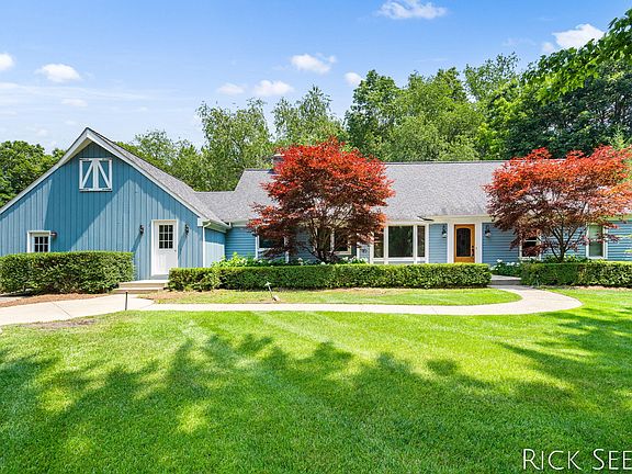 Spacious 4-bedroom walkout ranch with over 4,500 sq. ft. on 5 acres, offered as two separate parcels (2.65 & 2.39 acres). Enjoy your own private retreat with an inground pool, tennis court, and abundant natural beauty and wildlife in a highly desired Ada location. The private drive is shared with only one other home. Several updates include a newer furnace, water heater, composite deck, garage doors, and septic tanks. Kitchen features a snack-bar island with Jenn Air cooktop, double oven, and generous storage in the mudroom area. All bedrooms are oversized, plus the large bonus room. Walkout level offers family/rec rooms, wet bar, office, 2nd fireplace, and 3 sliders to the patio. A 24x24 pole barn completes this unique property.