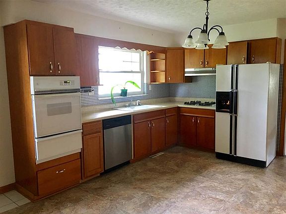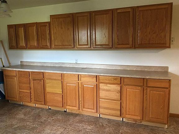 One floor plan. Has added kitchen cabinets, stove and dishwasher since 2015. Corner lot with 2 car detached garage with storage above. Garage has heat source, water and gas.