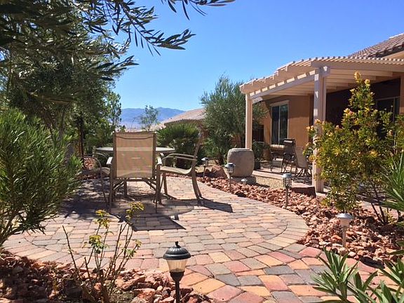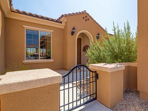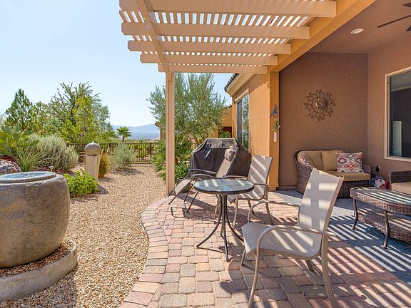 SID Is Paid in Full! This exceptional Marigold is located in Overland Trail in Sun City AND HAS A THIRD CAR DETACHED GARAGE. The home is well appointed throughout and the outdoor door space is awesome. From the extended covered patio enjoy a gorgeous view of the eastern mountains and distant desert bluffs. The beautifully designed yard has paver walk ways and sitting areas add a touch of tranquility. The space is private and fully fenced. The front has a nice court yard and the detached third car garage is ideal for storage. The home has extended tile, warm paint tones, upgraded lighting and fans and gorgeous cabinetry. The granite, stainless appliances and pendant lights are attractive and the pull out shelves in the kitchen are convenient. The water softener, R/O, under cabinet lights and top down bottom up window coverings are a bonus. The floor plan is open and offers two spacious master suites and a den/office. The laundry room has cabinets and sink and the costly washer and dryer are included.