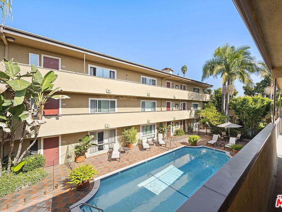 A location that must be experienced to be believed! 970 Palm Ave #218 sits on the top floor of a lush, tropical mid-century building that's so beautifully maintained, its charm is immediately apparent. Peacefully tucked away in the heart of West Hollywood, this hidden gem is surrounded by the city's most iconic destinations: the Sunset Strip, Santa Monica Boulevard, the Norma Triangle, and just moments from Beverly Hills. Live steps from the best of LA, where world-class dining, legendary nightlife, chic boutiques, and cultural landmarks are right outside your door. This move-in-ready home blends mid-century character with modern updates, offering roomy layout, a sleek kitchen with new LG refrigerator, and a spa-inspired bath with a skylight that fills the room with natural light. You'll also love the large extra-tall window in the living/dining area facing the center courtyard, allowing tons of light with foldable shutters that provide privacy when desired. With only one shared wall and no neighbors above or below, you'll have an uncommon sense of privacy rarely found in city living. Enjoy resort-style amenities including a sparkling pool, spa, keyless entry, 1 secure parking spot, private dog walk, and impeccably maintained grounds all within one of West Hollywood's most walkable and desirable neighborhoods.