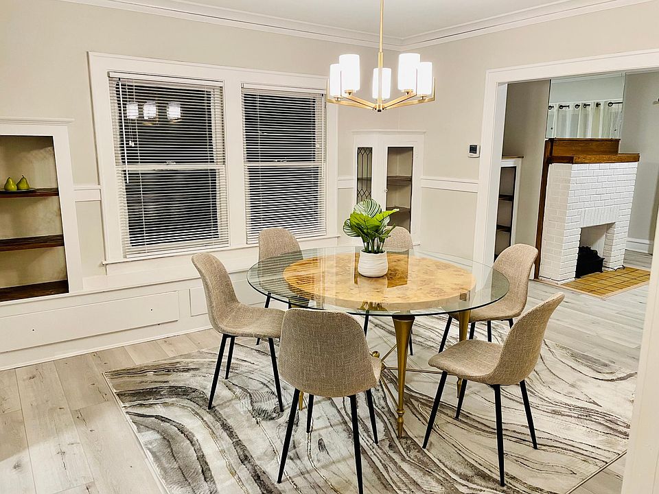 Serene primary bedroom suiteCenter marble-top islandCustom white cabinetryFully fenced backyardFormal dining roomSleek marble countertopsCozy fireplace
