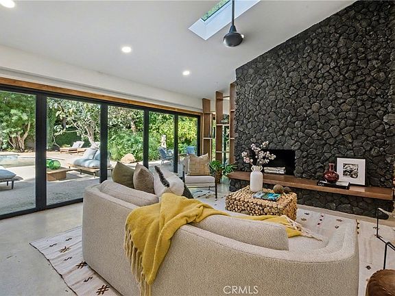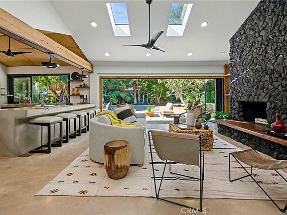 Custom concrete finishes and lava rock accents bring a subtle island aesthetic home. Accordion-style bi-fold doors open to the backyard, where a pool, spa, and tanning ledge sit amid lush tropical foliage. The result is seamless indoor outdoor living that defines the Southern California lifestyle.