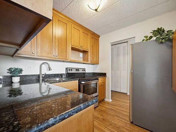 Welcome to this stunning Top-floor 1 Bedroom, 1 Bath condo, offering a perfect blend of comfort and style. This exquisite unit boasts a private balcony that provides serene views and an ideal spot for morning coffee or evening relaxation. Spacious living area with large patio door and dining room. The well-appointed kitchen with laminate floors, stainless steal appliances, granite countertops and 48" cabinets. Elegant Bedroom with large windows and a spacious nook perfect for your desk or another closet. Fresh paint throughout, updated bathroom with stylish vanity makes this condo move in ready. Community Features: Outdoor pool, clubhouse, gym, lots of parking for you an your guests, elevator in the building, laundry room on each floor and private storage room located on the 5th floor. Walking distance to shopping, dining and entertainment options. Enjoy easy access to public transportation and major highways. Pets are ok, rentals allowed after 2 year ownership. Don't miss the opportunity to make this your New Home!