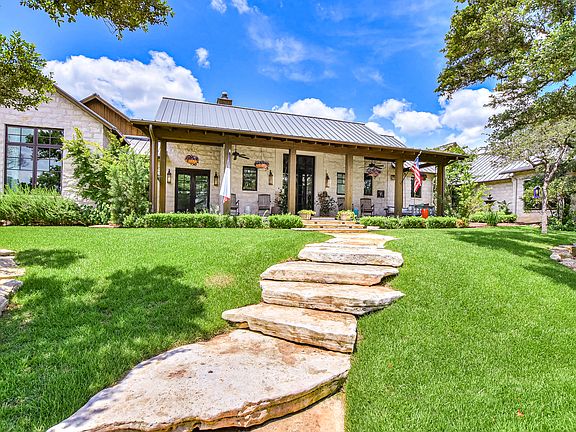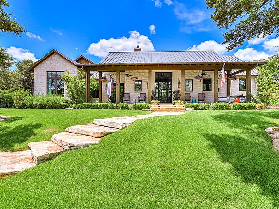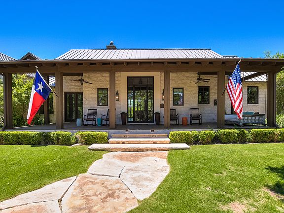 The wide, welcoming front porch hearkens to traditional Texas farmhouses, as does the warm limestone exterior. Double doors welcome you to the spacious, rustic-beamed great room that opens on the opposite side to a wide covered veranda overlooking the spacious lawn and view beyond. Entertain in style, offering guests a drink from the charming iron-gated bar as they stroll from indoors out to enjoy the breeze. The adjacent gourmet kitchen is outfitted with Saltillo tile and a brick wall adding warmth and texture; two islands will thrill the chef of the family and provide plenty of space to gather.