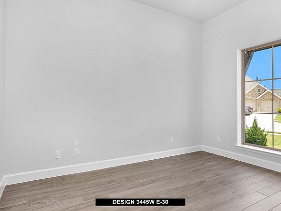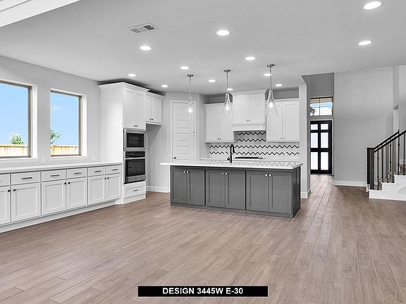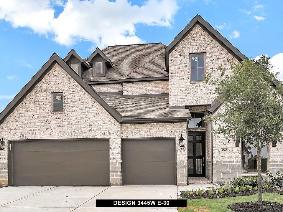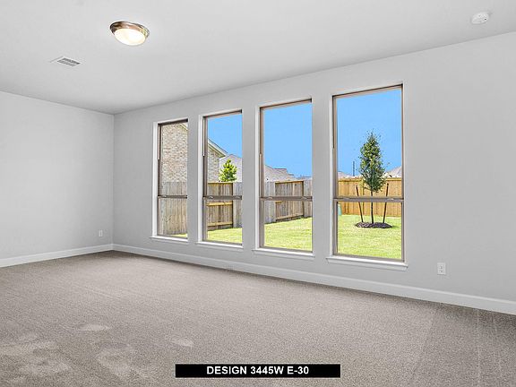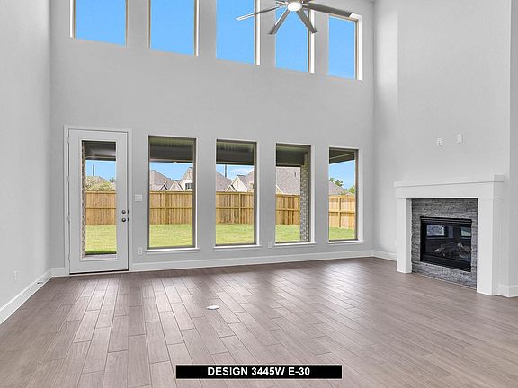Home office with French doors frames the 19-foot entry. Generous family room with a grand wall of windows, wood mantel fireplace and a 19-foot ceiling flows into the dining area. Island kitchen with built-in seating space features a walk-in pantry. Secluded primary suite features a grand bedroom with a wall of windows. Primary bathroom offers a double door entry, dual vanities, garden tub, separate glass enclosed shower and two walk-in closets. Guest suite with full bathroom and walk-in closet on first floor. Second level hosts secondary bedrooms, a Hollywood bathroom, a media room with a storage closet and a game room with three large windows. A utility room and a half bathroom complete this generous design. Covered backyard patio. Mud room just off the three-car garage with additional storage space.