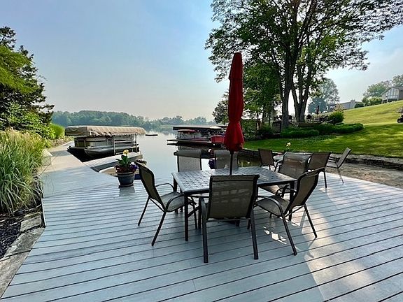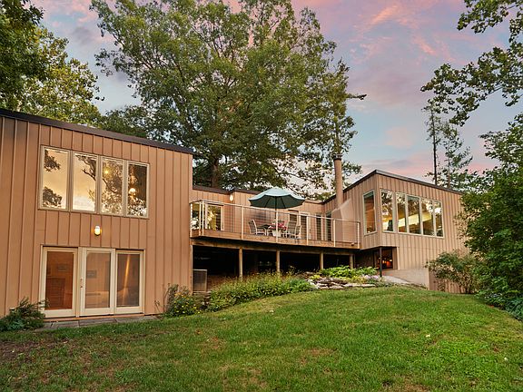 Hoping to enjoy lake living this summer? This beautiful Harry Weese designed home with Harrison Lake access has many one-of-a-kind design features including walls of windows that highlight the secluded and wooded outdoor space surrounding the home. The interior also features large rooms, exposed beams, 2 walk-out lower levers, 2 primary suites, and 2 fireplaces. The huge deck provides plenty of space to enjoy outdoor living overlooking the nearly one-acre property with oak, maple, sycamore, pine, redbud, and dogwood trees plus winding river-stone walls. A large, grassy flat yard and an outdoor basketball goal are great play spaces for all ages. This is a well-maintained home with both a new roof and solar panels (2019). The shared dock includes an assigned boat slip, a spacious deck for outdoor dining, and a sandy beach for kids to play. The garage includes a 220 outlet and a possible third bay just right for a golf cart. This property is a short drive from the HLCC par 71 championship golf course and the 108-acre nature preserve. Come tour the home, neighborhood, and lake you've been hoping to find!