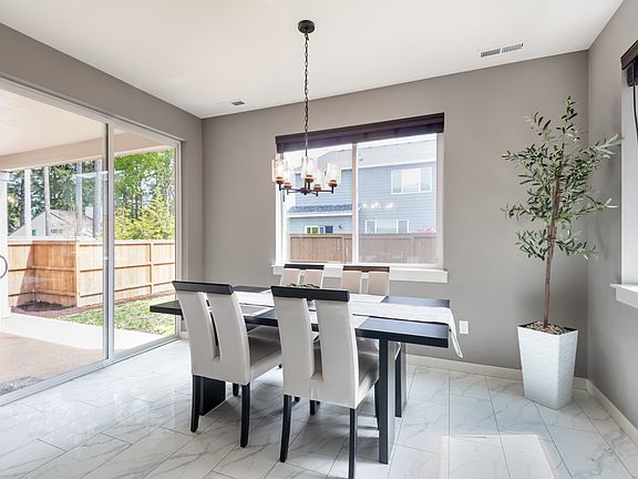 The gourmet kitchen is a central gathering point, complete with a massive island with bar seating, stainless steel appliances, and everything you need for cooking and entertaining. A formal dining area with seating for six provides the perfect space for family meals or dinner with guests.