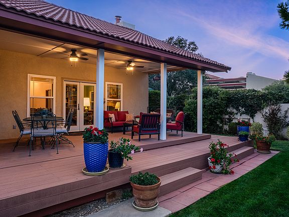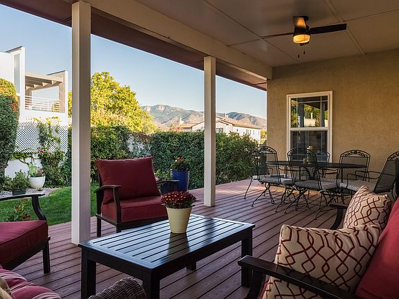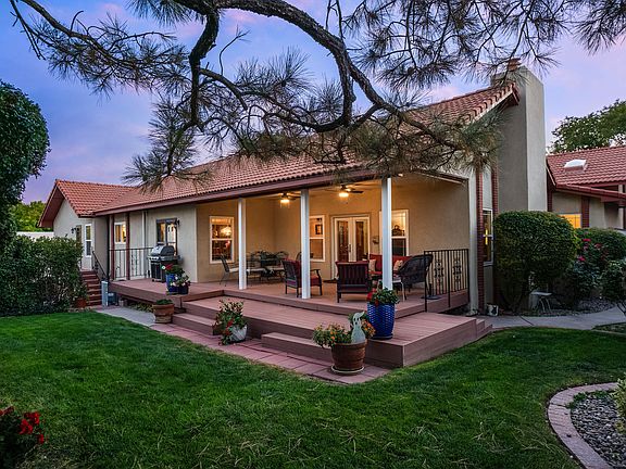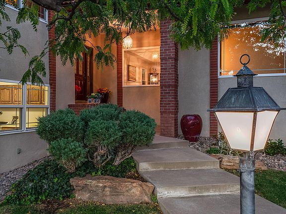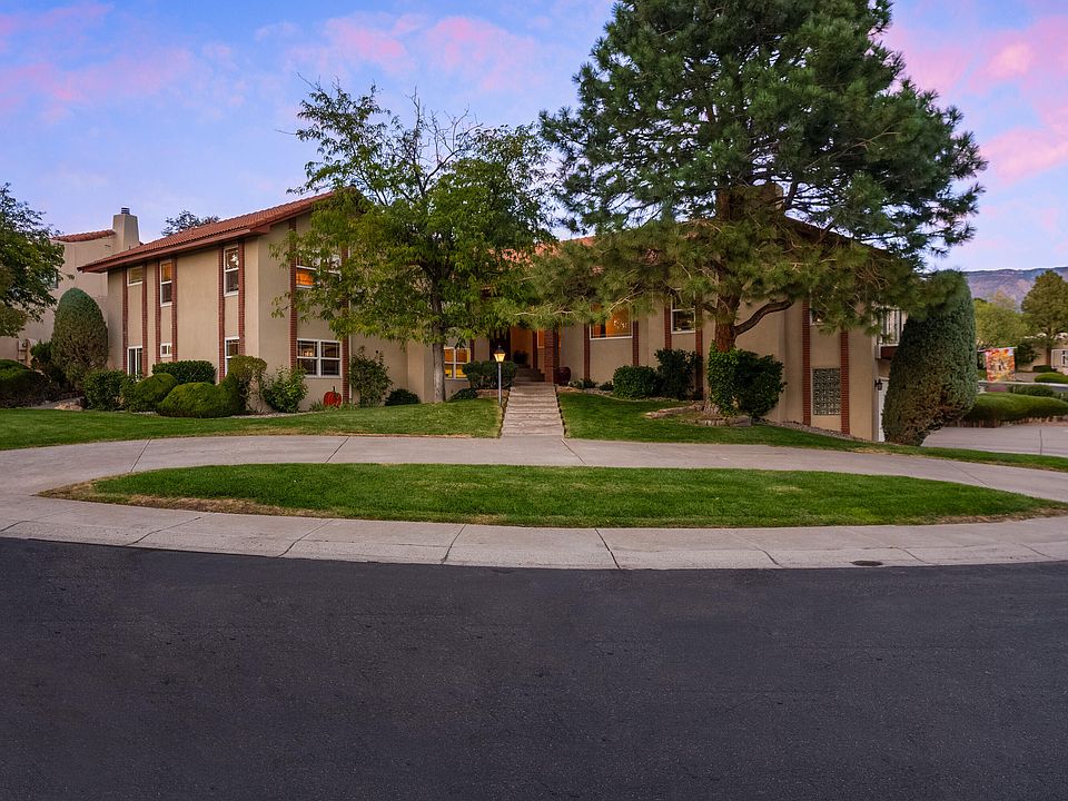 Charming 4-bed home situated on a spacious lot in the desirable and gated community of Tanoan West. Speckled with trees and mature landscaping, this wonderfully maintained residence boasts a cozy living room with fireplace that leads into the formal dining space which opens into the kitchen and family room with an abundance of natural light. The unique floor plan seamlessly connects the living spaces and bedrooms for a separated yet inviting layout. Extra space in master for gym/office. Enjoy the serene backyard with a covered patio, lush landscaping, and breathtaking mountain views. Home boasts a three car garage AND and off street parking/backyard access. Refrigerated air, newer windows. A true gem with highly rated schools, convenient to shopping and dining in a wonderful community.