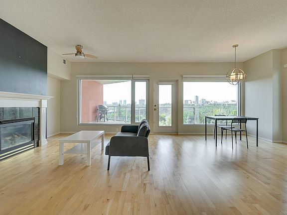 SPECTACULAR RIVER VALLEY VIEW from this 1559 sq.ft. 2 bedroom + den, 2 bathroom southwest CORNER UNIT in RIVERVIEW GREEN conveniently located with the river valley trails & the LRT at your doorstep & close to shopping, the Ice District & quick access to the U of A. Modern open floor plan with 9' ceilings, floor to ceiling windows, gas fireplace, & spacious balcony with great views & a gas BBQ outlet. The kitchen features maple cabinetry, white appliances, a pantry & access to the northwest facing balcony. Next to the living area is a den. The 4 piece main bathroom is next to the second bedroom. The primary suite has a 5 piece ensuite bathroom with a soaker tub, walk-in shower & double vanity. UNDERGROUND PARKING #47 on P1 & an extra storage locker #39 on P2. Riverview Green is a Green building with high efficiency heating & air exchange & fresh air intake for each unit + exceptional sound proofing. Amenities include a fitness & party room, library, guest suite, car wash & workshop. PET FRIENDLY.