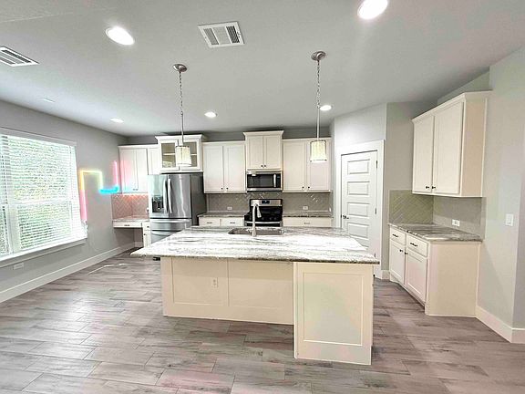 Absolutely stunning, northeast facing. Zoned for exemplary RR ISD: England Elementary & Pearson Ranch MS. Open FP w secondary bedroom & full bath down. Wood looking tile floors. Modern kitchen w beautiful granite CT, Herringbone subway backsplash, chic white cabinets with hardware, large island with designer accent color and pendant lighting. Game room upstairs with covered balcony.