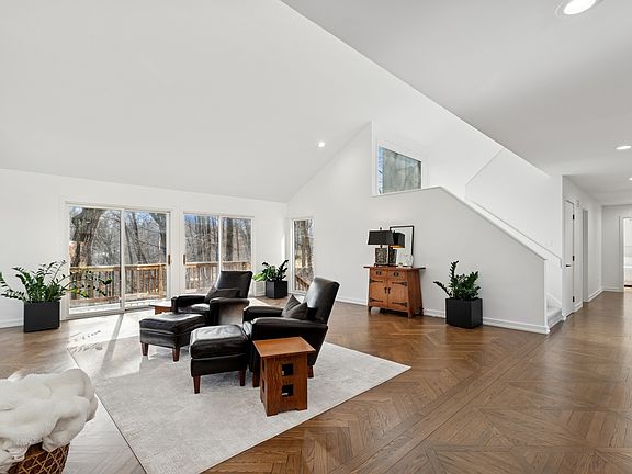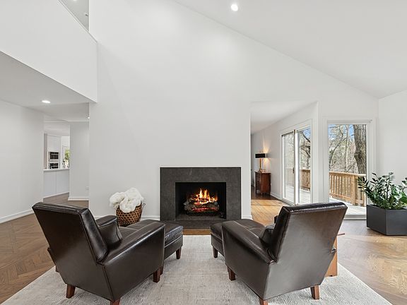 This stunning contemporary home blends expansive, open living spaces with intimate retreats, offering breathtaking views of a surrounding ravine. Abundant windows invite natural light and frame the serene landscape. The chef's kitchen features custom cabinetry, a large quartz island, and high-end appliances (Wolf, Miele, Subzero), while the breakfast nook opens onto an expansive deck. The main level includes a private primary suite with a spa-like bath, a luxurious walk-in closet, a library with a fireplace, a vaulted dining room, and a custom pantry. Upstairs are two spacious en-suite bedrooms with walk-in closets. The finished lower level offers a rec room, office/bedroom, full bath, and ample storage. Set on nearly an acre of professionally landscaped grounds, this rare gem provides unmatched privacy in an ideal location. A true sanctuary blending style and comfort.