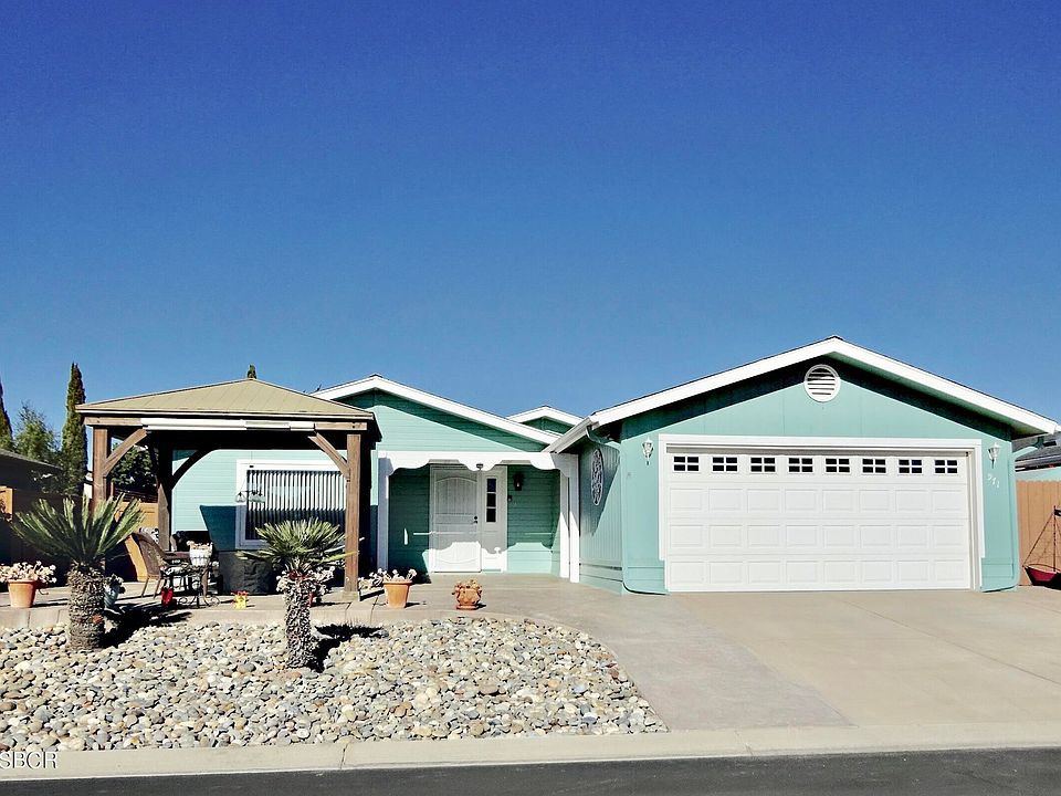 Available one of the few TRIPLE-WIDE homes located in popular Quail Meadows East Senior Park. Approx. 2100 SQFT including the permitted enclosed patio Rm. and a bonus Rm. Could be Office/ Gym, Sewing Rm. Your choice. A Great room which features a stylish wet bar perfect for entertaining. Includes a 65 in mounted TV. The kitchen has been recently redone with new Quartzite counter tops and breakfast bar. Canned lights, new appliances, fixtures, hardware and ceiling fan. New vinyl flooring. Adjacent is the charming separate formal dining rm. with dual pane windows, a built-in hutch with concave glass doors and lighting. Includes mounted TV. Both bathrooms have been upgraded. Primary bath features a tiled shower with extra cabinets, the 2nd bath features a walk-in tub jacuzzi. NEW ROOF!! The front entertainer's gazebo has a firepit, table & chairs. And electric Sun/Wind shades. Security motion light. Large Garage includes built in storage closets.NEW ROOF!!
