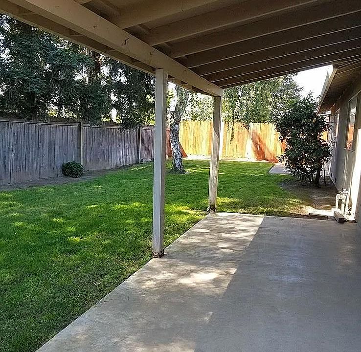 Private backyard with covered patio. Meyers lemons, limes, and yellow Roses.
