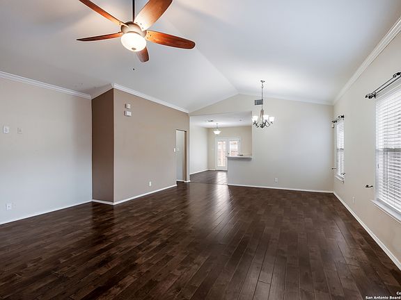Discover the charm of this stunning residence nestled in the sought-after Cedar Springs community of Helotes! This rare gem features three spacious bedrooms and three full bathrooms, making it an ideal choice for families. The expansive open floor plan boasts soaring ceilings, creating an inviting atmosphere throughout. Situated on a desirable corner cul-de-sac lot, the property offers a generous backyard perfect for outdoor activities. The large kitchen is a chef's dream, equipped with ample cabinet and counter space and a breakfast bar that is perfect for hosting gatherings and entertaining guests.