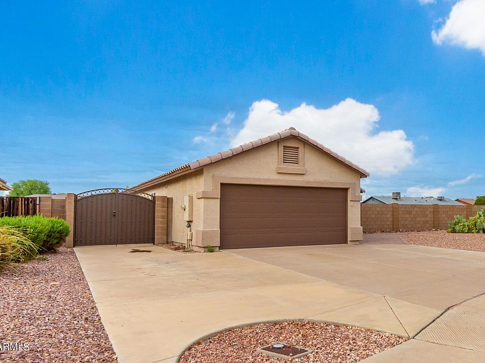 Price Improvement!!! This 3-bedroom beauty sits on an oversized 10,000 sqft lot and showcases a great curb appeal with a desert landscape, a 2-car garage, two RV gates, and a paver front patio/ courtyard. There is no other home on the market with this many superior features such as an oversized lot, two RV gates, newer A/C, and large Tough Shed. The interior boasts a spacious living room with a nude shiplap wall, vaulted ceilings, wood-plank tile flooring, and an earth-tone palette. The sizable eat-in kitchen features track lighting, ample oak cabinets, built-in appliances, and a center island that adds to the counter space. The large primary suite has plush carpet, a wood-accented wall & a full bathroom. Out the back, you'll find an enclosed patio ideal for entertaining year-round. The divided backyard offers a fenced paver patio, RV parking, a storage shed, and so much room to get creative. This blank canvas can be transformed into a desert oasis with room for a pool. Truly, this is a one-of-a-kind home awaiting its new owner to make its own. Act now!