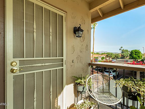 This second story end unit offers beautiful views of the McDowell Mountains. The community offers a wide array of activities including 9 tennis courts, 5 pools, pickleball, fitness center, and access to free kayaks and canoes at Scottsdale Ranch Lake. The previous gas fireplace has been removed allowing for more space in the living room. New dishwasher was just installed. Beautiful wood built-in cabinets and wine rack. The unit has two extra storage closets with one located on the deck and an additional closet on the ground level. Unit has its own designated covered parking spot. Furnishings could be negotiable. Come enjoy The Racquet Club at Scottsdale Ranch and its neighboring spring training parks, shopping, restaurants, Westworld and casinos. You will not be disappointed.