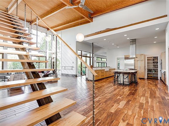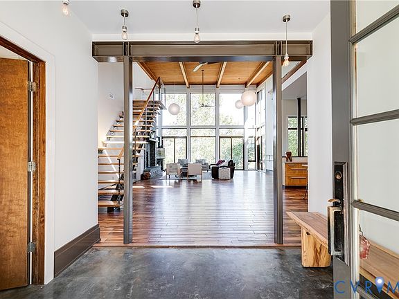 Extraordinary riverfront contemporary home with rare private access to the James River! This architectural gem blends dramatic design with comfortable living and stunning natural views. This home known as “The Igloo House" was originally created by artist Demetrios Mavroudis and was masterfully reimagined with thoughtful additions and modern luxury while preserving its artful history. Walls of glass, vaulted ceilings with exposed beams, marble floors from the Federal Trade building, architectural details from the University of Richmond and open living spaces capture the light and the river from nearly every room. The chef’s kitchen features SubZero and Wolf, quartz counters and an oversized island — perfect for entertaining. The spacious primary suite offers panoramic river views, spa bath with heated floors and exceptional custom cabinetry in the large walk-in closet. There is an additional en-suite bedroom/bath combo, 2 additional bedrooms with a hall bath to share, a 5th possible bedroom with a full bath and a large main floor laundry room. There are 2 additional versatile offices and studio spaces, which provide flexibility for modern living. The oversized former garage houses amazing storage, a huge workshop, an office and an incredible climbing wall gym with "sprung" floor. This space could easily be repurposed to a parking garage again. Outdoor spaces include expansive decks and balconies, a koi pond, stone fire pit and direct access to the flatwater for kayaking and canoeing. Set on over 2 acres with landscaped gardens and spectacular sunsets over Bosher’s Dam, this home is a one-of-a-kind Richmond landmark featured in RHome, Modern Home, and HGTV. Every stone, beam and piece of metal tells a story in this home. What began as a park ranger's home, then became an artist's studio and now stands as a deeply loved riverfront retreat for a family. It is now your turn to start your new lifestyle and write your next chapter in this exceptional and special place.