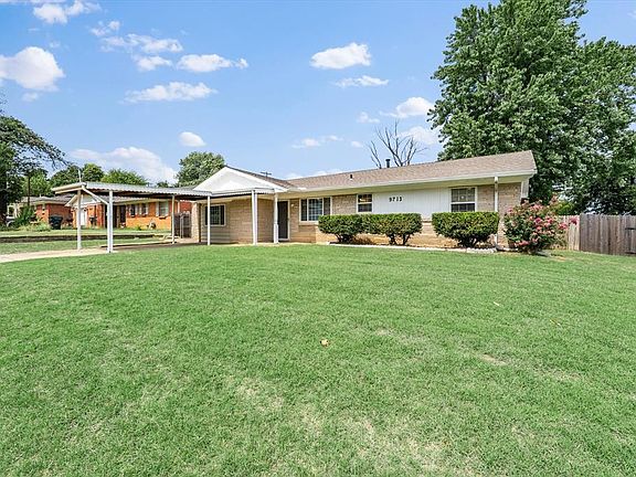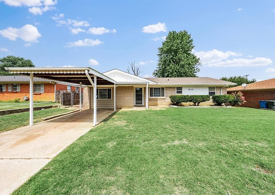 Welcome to 9713 Harmony Drive, updated and move in ready - 3-bedroom, 1-bath home offering 1,214 sq. ft. of comfortable living with easy access to Tinker AFB, I-40, shopping, restaurants and more. Inside, wood flooring carries through the main areas, while the converted garage provides a versatile second living space with new carpet—perfect for a media room, playroom, or home office. The kitchen has been beautifully updated with butcher block countertops, stylish tile backsplash, refreshed cabinets, a new dishwasher, microwave, and gas range. Every bedroom includes upgraded lighting, new ceiling fans, and illuminated closets, while the bathroom showcases professional updates with new tile, modern fixtures, and a new cabinet and sink. Thoughtful details continue with abundant storage throughout and a utility room with direct access to the backyard. Outdoors, enjoy the covered carport, a spacious covered back porch ideal for gatherings or relaxing evenings. The large fenced yard provides plenty of room for pets, play and gardening, along with a handy storage shed. A newer hot water tank completes the updates for peace of mind. With professional upgrades throughout including whole house painting outside and inviting spaces inside and out, plus window treatments throughout, this move-in ready home is the perfect blend of style, comfort, and functionality. Check out the Property Information attached for all the deets on updates. Welcome Home!