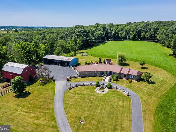 Truly exceptional is the only way to describe this property. An enchanting drive along a long, private lane leads you past open pasture and a gently flowing stream before unveiling a breathtaking setting with panoramic views, a classic red barn, and an all-brick ranch perfectly positioned in complete seclusion. The approach itself feels almost storybook, and leaving the property is only tempting to take in the incredible views once more on the way out. This remarkable estate offers approximately 75 acres of rolling countryside featuring crop fields, pasture, hunting ground, a stream, fishing pond, swimming pool, pavilion picnic area, fruit trees, and a multi-acre fenced garden ideal for serious growers or homesteading. Additional highlights include a barn, workshop, circular driveway, fountain, and the potential for subdivision into additional building lots. The 3-bedroom, 2.5-bath all-brick ranch home showcases handcrafted woodwork created in the on-site workshop, a granite kitchen with solid hardwood cabinetry, spacious living room with fireplace, formal dining room, mudroom with laundry, and a full unfinished basement ready for future expansion. The lower level features a wood stove for efficient supplemental heat, complemented by a new heat pump installed in 2022. Whether you’re searching for a forever home, working farm or ranch, private retreat, or legacy property, this offering delivers space, privacy, and a sense of enchantment rarely found. Private showings only. Please respect the owners’ privacy—access to the property is by scheduled appointment with a licensed agent.