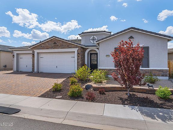 Located in the prestigious gated community of Sorrento Trail at Bella Vista Ranch in South Reno, this single-story home showcases the well-designed Alava floorplan with a massive great room and a striking 12' sliding door system that seamlessly connects indoor and outdoor living spaces. 9713 Silverspar St. features over 175,000 dollars in builder upgrades throughout 3178 s.f. with 4 bedrooms and 3.5 bathrooms., Each of the 4 bedrooms is located in a separate wing of the home while the designer finishes highlight luxury, comfort, and functionality in every detail. Interior features include: an open-concept floorplan with a welcoming foyer and tray ceilings; chef's dream kitchen with upgraded cabinetry, custom backsplash, granite slab countertops, gas cook-top with hood, drop-pendant lighting over the center island/breakfast bar, informal dining area, walk-in pantry and direct access to the adjacent formal dining room; family/living room with ceiling fan, Primo 48" Heat and Glo linear gas fireplace with fan, and slider to the covered patio; primary suite with ceiling fan, dual sinks with marble countertops, walk-in shower with bench, separate water closet, and an enormous walk-in closet; two en-suite secondary bedrooms, each with a shower stall; a 4th bedroom with ceiling fan and walk-in closet; half bathroom; and a laundry room with sink, cabinets and shelves. Exterior features include: low-maintenance landscaping in front and back; over 50,000 dollars in backyard landscape and hardscape with an extended and covered patio/loggia, uncovered patio, in-ground hot tub, custom water feature, pet turf, and an outdoor kitchen with granite countertop, gas bbq and two refrigerator drawers. Recent improvements and bonus features include: newer bamboo wood flooring in the 4th bedroom/office; new 24kw Generac whole-house generator; upgraded tile flooring throughout main living areas and walkways; plantation shutters; insulated garage doors; and an upgraded insulation package.