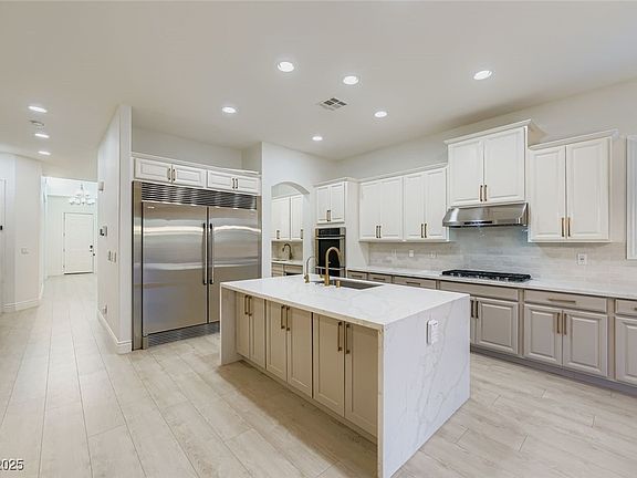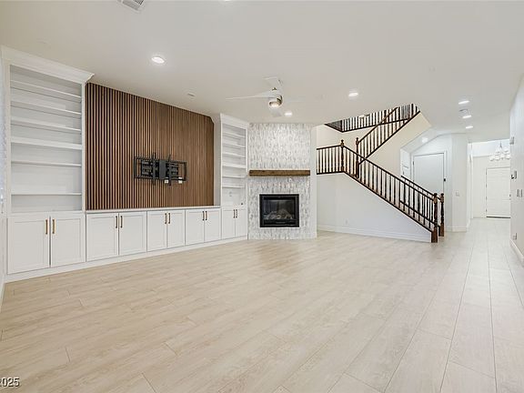 Stunningly upgraded 2-story home with 3-car garage in northwest Las Vegas. This north-facing residence is filled with natural light and over $100K in 2024 renovations, making it move-in ready and highly desirable. Featuring 6 bedrooms including dual primary suites, 4.5 baths, and a spacious loft, the layout blends comfort and flexibility for multigenerational living. The gourmet kitchen showcases new countertops with a waterfall island, Bosch and KitchenAid appliances, drawer microwave, beverage fridge, custom cabinets, and an under-sink reverse osmosis system. Every detail has been upgraded: fresh paint, new flooring, shutters, automatic shades, water softening and filtration system, ceiling fans, duct cleaning and sealing. The living room is a showpiece with a custom entertainment wall, acoustic feature panel, and tiled fireplace with new mantle. The garage is finished with epoxy flooring, fresh paint, and five overhead racks. Outdoors, enjoy a pool-sized lot with covered patio.