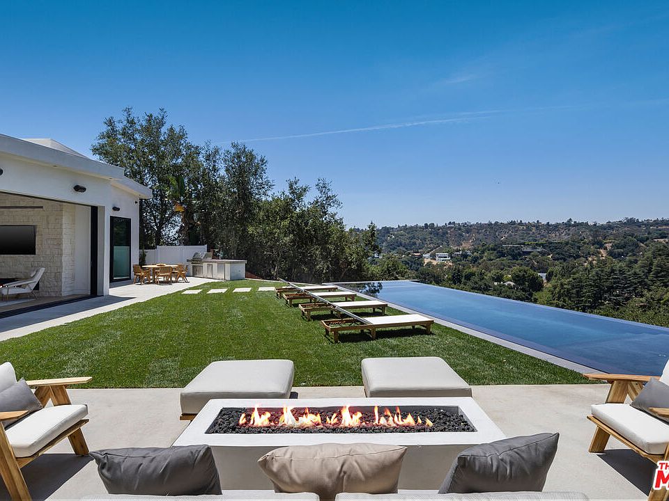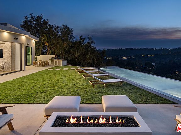 Tucked away on a quiet cul-de-sac in the prestigious Beverly Hills Post Office area, this newly completed modern masterpiece offers breathtaking jetliner canyon views. Privately gated for maximum security and seclusion, the home showcases soaring 18-foot mahogany-clad ceilings, multiple skylights, a dramatic 16-foot-tall library, and expansive sliding glass doors for seamless indoor-outdoor living. The dramatic black-tiled pool, perched on five structural caissons, features a stylish Baja shelf - perfect for lounging in privacy while enjoying the view. Distinctive interior finishes include white oak flooring, Calacatta Cremo countertops in the kitchen, Fantasy Pink marble vanities in the guest suites, and a powder room with Calacatta Picasso marble and Roman clay walls. Custom walnut cabinetry adds warmth and sophistication throughout. The primary suite features a serene sitting area, a large custom walk-in closet, and a spa-like bath with a soaking tub overlooking the stunning views. Outdoors, enjoy a full kitchen equipped with a sink, BBQ, and refrigerator, along with a built-in fire pit perfect for entertaining. Every detail has been thoughtfully curated to elevate both design and function. With world-class finishes and exceptional craftsmanship, this home is a true expression of luxury living.