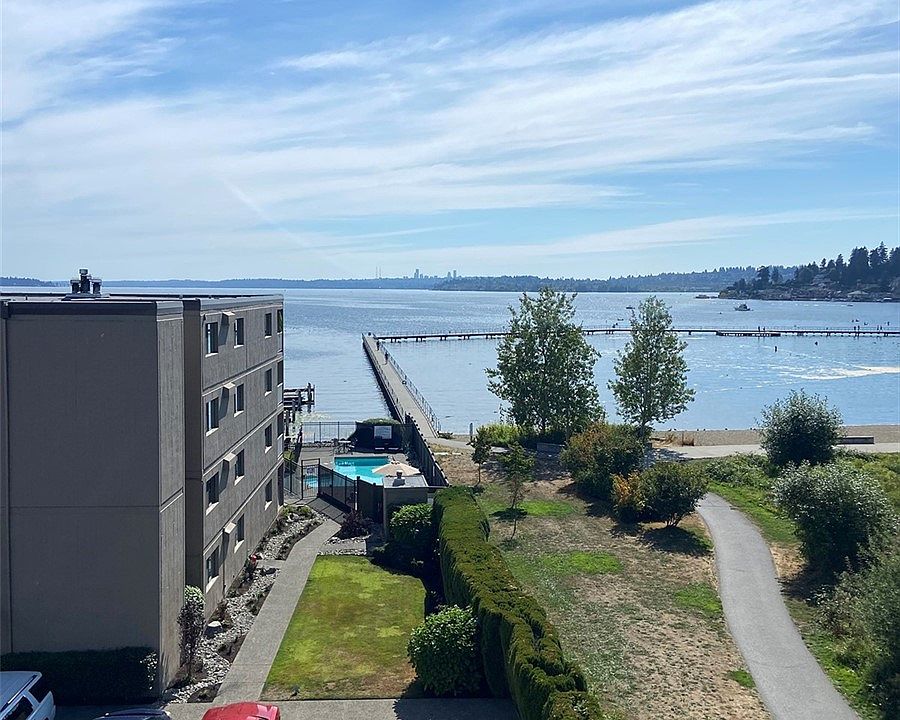 Covered balconyTop corner unitSeattle skylineOverlooks juanita beach parkPrivate detached garageOutdoor swimming poolReserved parking space