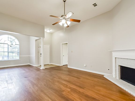 Step inside to a bright living room featuring LVP flooring, high ceilings, and a classic white fireplace. The kitchen includes stainless-steel appliances, generous cabinet space, and a breakfast nook that opens into the dining area. The primary suite offers a spacious layout with a walk-in closet and a large bathroom, complete with double sinks, a soaking tub, and a tiled shower.