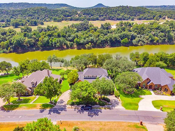 Stunning riverfront home in the gated, golf community of Pecan Plantation. This 3 bed, 3 and half bath home has been meticulously cared for and is ready for you to move in! Walk through the door to beautiful hardwood floors throughout living area and waterviews all along the back of the home! Lots of natural sunlight for light & bright space. Spacious bedrooms, with master on first floor. Large office off master. Kitchen has granite counters and island with eat-in breakfast nook, stainless appliances, and an abundance of cabinetry. Upstairs features a large media room with wetbar and a door that leads out to the balcony patio. Backyard is an oasis with a large covered porch, lush, landscaped yard & waterviews!