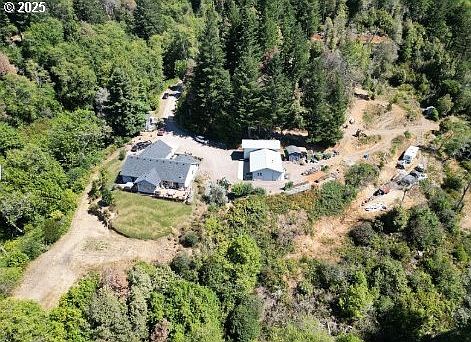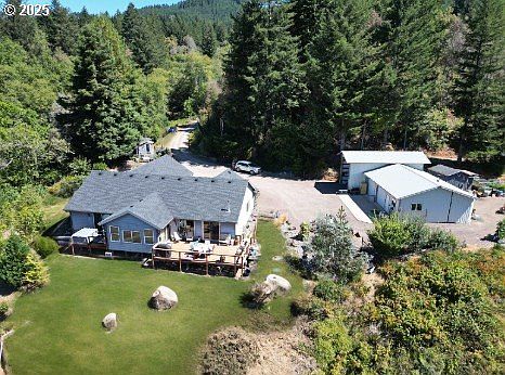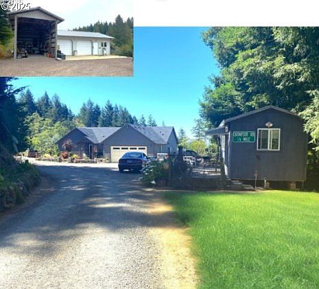 Private Mountain Retreat with 4-car garages, Workshop, RV Covered Parking (32Lx13Wx14H), detached Guest Quarters and more on 7.46 aces! This gated property at the end of a ¾-mile gravel road,(comprised of two non-dividable tax lots) has documented water rights. The property offers an exceptional combination of modern comfort and country charm. Home built in 2017, primary residence, guest cottage, detached garages, workshop, all reflect thoughtful design and contemporary finishes throughout. The main home is beautifully maintained 2Bd/2Bth, spacious primary suite has direct access to deck w/hot tub, walk-in closet, and an elegant tiled shower and garden window, complete w/granite countertops, dual modern vanities. The chef’s kitchen is designed for functionality and style, showcasing floor-to-ceiling cabinetry, granite countertops, stainless steel built-in appliances, large walk-in pantry. Adjacent is a laundry room w/sink, counter space, and newer washer and dryer. Off the dining area, a sunroom or office/den with abundant natural light w/peaceful mountain views, ocean peeks and access to the hot tub. The living room features a warm and inviting gravity fed wood-pellet stove and large windows that frame the natural surroundings, flowing to the back deck—perfect for relaxing or entertaining. For visiting family or friends, the detached guest cottage offers a charming space, sleeping 2, bathroom/shower, and a covered porch—both cute and practical. The property includes a detached two-car garage adjoining a large workshop w/concrete floors, on-demand hot water, second water heater, and bathroom. Additional amenities; contracted and maintained sand filtered septic system. Covered RV parking with electrical hookups (no sewer), a tool shed, wood shed, chicken coop, electric fence, 4 water storage tanks, raised garden beds, mature fruit trees. A fantastic opportunity to own acreage to grow, or relax on a private dream coastal retreat!