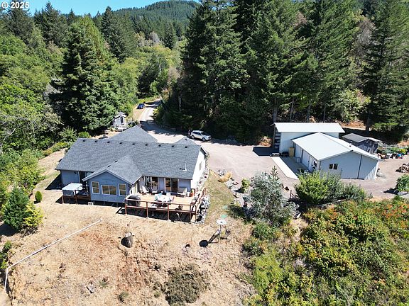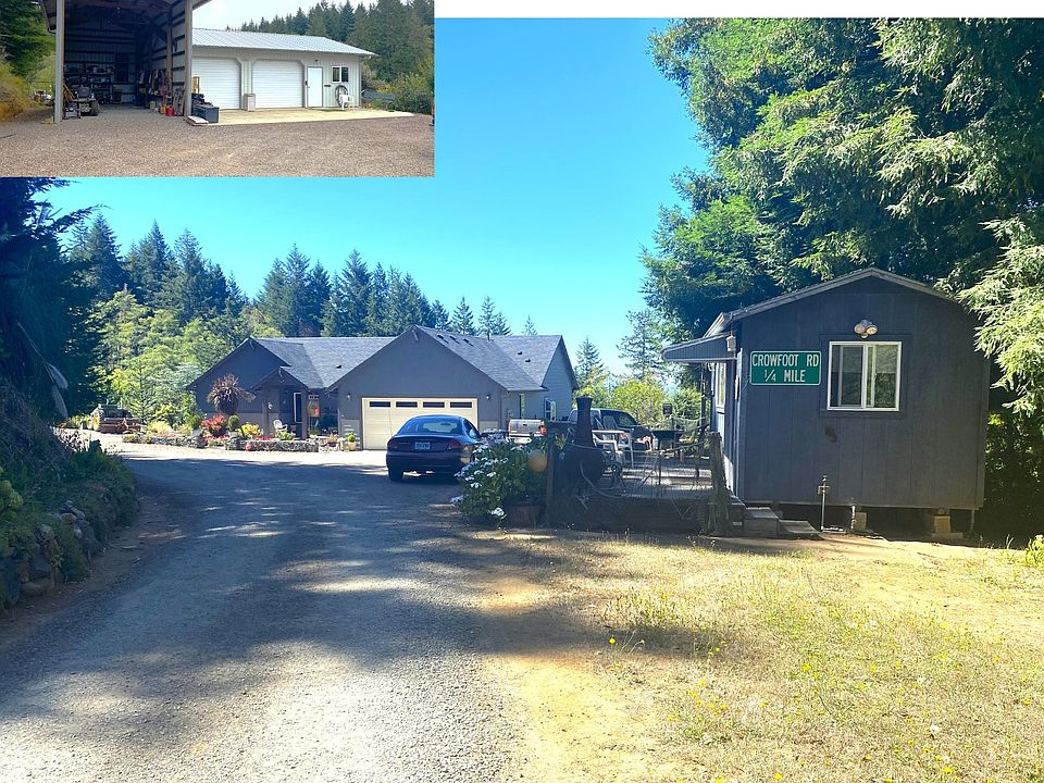 Private Mountain Retreat with 4-car garages, Workshop, RV Covered Parking, detached Guest Quarters and more on 7.46 aces! This gated property at the end of a ¾-mile gravel road,(comprised of two non-dividable tax lots) has documented water rights. The property offers an exceptional combination of modern comfort and country charm. Home built in 2017, primary residence, guest cottage, detached garages, workshop, all reflect thoughtful design and contemporary finishes throughout. The main home is beautifully maintained 2Bd/2Bth, spacious primary suite has direct access to deck w/hot tub, walk-in closet, and an elegant tiled shower, complete w/granite countertops, dual modern vanities. The chef’s kitchen is designed for functionality and style, showcasing floor-to-ceiling cabinetry, granite countertops, stainless steel built-in appliances, large walk-in pantry. Adjacent is a laundry room w/sink, counter space, and newer washer and dryer. Off the dining area, a sunroom or office/den with abundant natural light w/peaceful mountain views, ocean peeks and access to the hot tub. The living room features a warm and inviting gravity fed wood-pellet stove and large windows that frame the natural surroundings, flowing to the back deck—perfect for relaxing or entertaining. For visiting family or friends, the detached guest cottage offers a charming space, sleeping 2, bathroom/shower, and a covered porch—both cute and practical. The property includes a detached two-car garage adjoining a large workshop w/concrete floors, on-demand hot water, second water heater, and bathroom. Additional amenities; contracted and maintained sand filtered septic system. Covered RV parking with electrical hookups (no sewer), a tool shed, wood shed, chicken coop, electric fence, 4 water storage tanks, raised garden beds, mature fruit trees. A fantastic opportunity to own acreage to grow, or relax on a private dream coastal retreat!