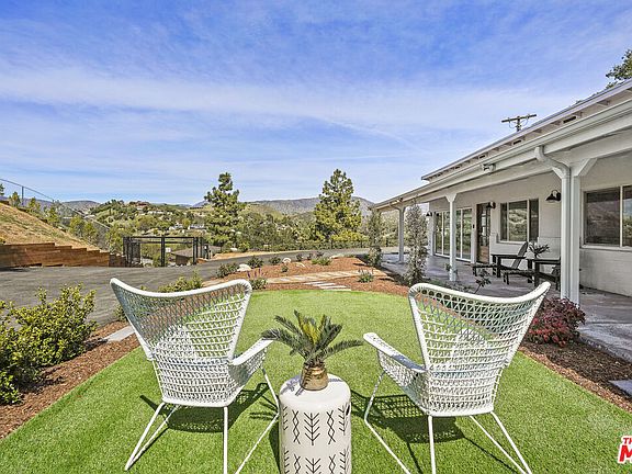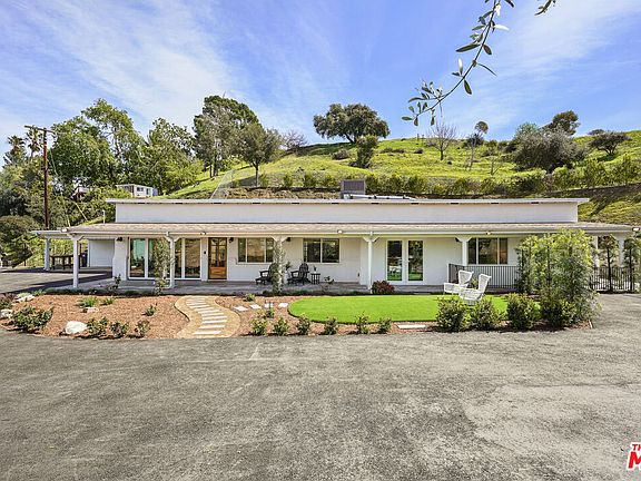 Welcome to this breathtaking 3-bedroom, 2-bathroom mid-century ranch-style estate, a designated horse property, located in the highly sought-after community of Shadow Hills, renowned for its natural charm and scenic beauty. Tucked behind a private gate, this exquisite estate has been beautifully remodeled, blending modern elegance with rustic character to create the ultimate sanctuary. As you arrive, a grand circular driveway welcomes you, offering both convenience and impressive curb appeal. This exceptional property boasts breathtaking panoramic views, showcasing the stunning natural beauty of Shadow Hills. You'll be captivated by the sweeping vistas of rolling hills, lush landscapes, and vibrant sunsets. Step inside to find a bright and airy open-concept layout, where gorgeous vaulted wood-beamed ceilings add warmth and character. Newer wood and tile flooring flow throughout, complementing the designer kitchen, which boasts quartz countertops, stainless steel appliances, and a spacious breakfast bar. Expansive newer windows bathe the home in natural light, while sleek accordion doors seamlessly extend the living space into the sprawling yard, perfect for entertaining or enjoying peaceful outdoor moments. The luxurious primary suite is a true retreat, boasting a spacious walk-in closet with custom-built-ins for effortless organization. The beautifully updated en-suite bathroom offers a spa-like experience, featuring a separate glass-enclosed shower and a deep soaking tub, perfect for unwinding after a long day. The additional bedrooms provide both comfort and sophistication, offering versatile space perfect for guests or a home office. The home also features a dedicated laundry room, thoughtfully designed for both style and functionality. This spacious area includes a side-by-side washer and dryer, quartz countertops, extra cabinetry for ample storage, a convenient sink, and a closet to keep everything organized and within reach. The property is beautifully framed by lush landscaping, with custom pavers guiding you through the meticulously maintained grounds. A terraced hillside adds a stunning element, creating multiple levels of outdoor space that offer both privacy and breathtaking views. This thoughtfully designed landscape provides the perfect backdrop for relaxation, entertainment, and enjoying the natural beauty that surrounds you. Embracing the beauty of its surroundings, this home sits adjacent to the scenic nature preserve, Fond Family Open Space, offering direct access to picturesque hiking trails. Whether you enjoy morning walks, horseback riding, or simply immersing yourself in nature, this tranquil setting provides endless outdoor adventures just steps from your door. Located in this tranquil, yet convenient setting, this property provides the best of both worlds: serene peaceful living just minutes from city shopping, dining, major studios, and easy freeway access. Opportunity abounds with potential for an addition, ADU or Jr. ADU. Schedule your private tour today and experience the serenity and beauty of this extraordinary estate.