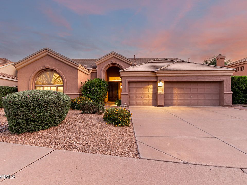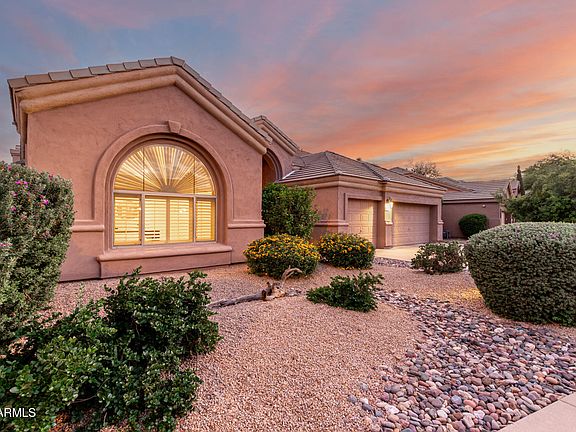Welcome to this stunning single-level luxury home nestled on a quiet, wide street lined with parks and few homes - offering exceptional privacy and tranquility. Set on a premium lot backing to a natural wash, the home's private south-facing backyard captures beautiful light, creating the perfect outdoor oasis. Enjoy a newly renovated PebbleTec pool and spa with elegant tile surround, and Pentair mobile app control for the waterfall, spa, lighting and heater. Multiple awnings shade inviting outdoor seating areas covered in Travertine and paving stones, ideal for entertaining and unwinding. Inside this dream home, discover gorgeous hardwood floors, folding glass doors that open the family room to the patio, and a cozy gas fireplace. The chef's kitchen impresses with double ovens, a pot filler, beverage refrigerator, custom built-in dining table, walk-in pantry, and lighted cabinetry. A unique upgrade to this model is a bar area with wine fridge adding a stylish touch for entertainment. The thoughtfully designed split floor plan of this 4 bedroom, 2.5 bathroom home features an expansive and private primary suite with a custom designed walk-in closet, barn doors, and a fully remodeled bathroom showcasing new cabinetry, quartzite counters, and designer fixtures. Additional highlights include Sonos sound system, Phyn auto-shutoff water detection system, battery-operated remote blinds, custom storage and epoxy floors in the 3-car garage with built-in work area, LG washer (with mini washer) and dryer, new roof in 2020. The custom primary bedroom wall unit and all televisions convey, ensuring a seamless transition to your new home. A truly unique, move-in-ready residence blending elegance, innovation, and comfort, perfect for both entertaining and serene desert living. Mortgage savings may be available for buyers of this listing.