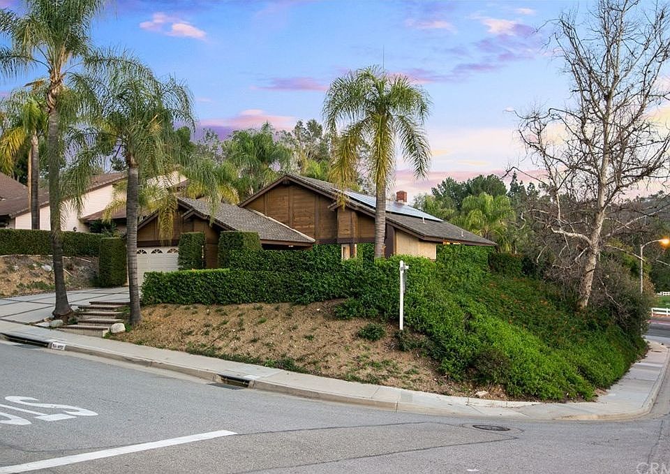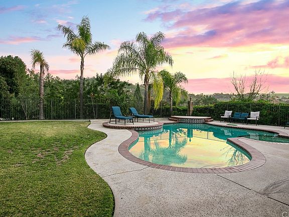 SINGLE STORY POOL HOME SITUATED ON AN ELEVATED CORNER LOT IN VIA VERDE. Excellent location as there is only one direct neighbor next door. A private front yard with a concrete/brick ribboned driveway, a large yard with low maintenance ground cover and a brick ribbon stairway lead to a covered front walkway to double door entry. As you enter the home you'll be greeted by soaring vaulted ceilings, a true open concept floor plan and views of the backyard and pool. The family room offers a floor to ceiling brick fireplace, slider to the backyard and carpeted floors. The kitchen features tiled floors, classic white cabinets, tiled counters, a built-in dining table, direct garage access and is adjacent to the formal dining room. The dining room offers vaulted ceilings, a chandelier and a slider to the back patio. Master bedroom also offers vaulted ceilings, carpeted floors and a slider to the backyard. Master bathroom offers a vanity with sink, private shower area and a walk-in closet. There are also two additional bedrooms and a full guest bathroom. The beautiful backyard offers a pool and spa, views of the hills and city lights, a grass area, built-in BBQ, covered patio and landscaped hillside. The home offers a solar system that will be transferred to the new owner. Although the property could use a little TLC, this is a great floor plan and the home offers a lot of potential.