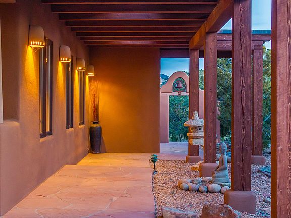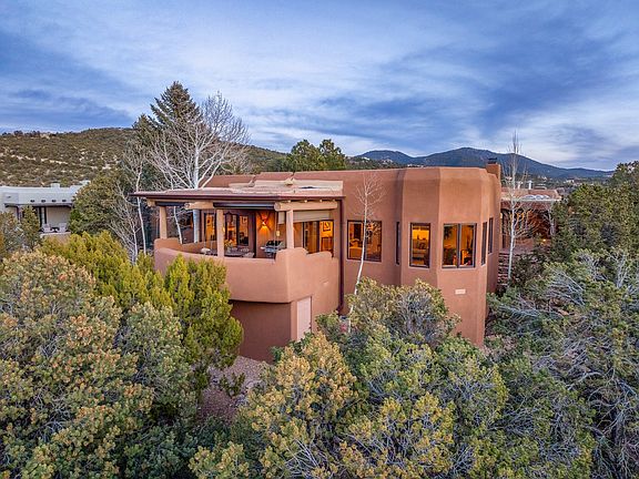 A view-filled Southwestern home on 1.2 acres in the desirable Northeast city limits and just minutes from The Plaza! This warm, single level residence offers four bedrooms, five bathrooms and is a view-filled downtown retreat. Upon arrival, an inviting entry arch, with a traditional bell, ushers you into a world of Southwestern sophistication. The foyer, adorned with high ceilings and wonderful natural light, sets the tone for a home that artfully blends timeless design with modern amenities. The heart of the home is an open-concept living/dining area that is enveloped by the panoramic views of the Jemez mountains. The formal living room features a beautiful gas fireplace and a charming banco designed for sunset views. The adjacent formal dining area seamlessly extends to a west-facing patio, perfect for dining under the Santa Fe skies. The kitchen boasts custom cherry cabinets, an eat-in island, and a cozy breakfast nook for casual family meals. A den provides additional space for a home office or flex room to suit your lifestyle needs. The thoughtfully designed layout includes two expansive bedroom suites—one of which is situated off a private hallway, offering a serene guest casita experience. The main bedroom hallway, with high ceilings and skylights, leads to the primary suite. This private retreat features dual walk-in closets, double vanities, a walk-in shower, and an indulgent soaking tub, creating a spa-like sanctuary. An additional guest bedroom, currently used as an office, includes an ensuite bathroom, while a third room—originally intended as a studio with a water stub-out—offers limitless potential as a creative space or guest room. The surprise of this property is the indoor aquatics room with a heated resistance pool, jacuzzi, sauna, and three-quarter bath. Lovingly maintained, 972 Indian Ridge Rd combines unparalleled views, a wonderful floor plan, and an unbeatable location—perfect for those seeking the ultimate Santa Fe luxury lifestyle.