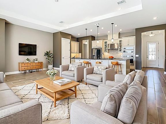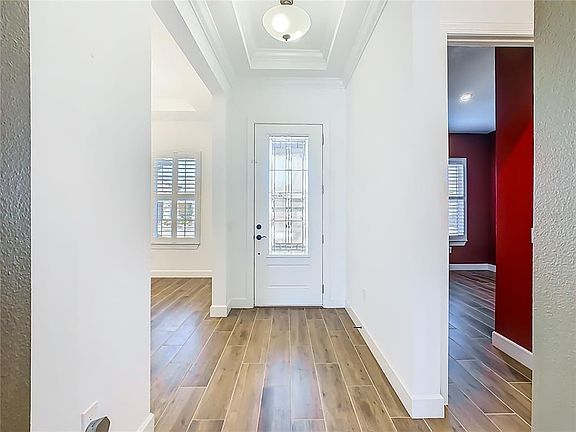Large islandBay windowsMediterranean-inspired architecturePorcelain plank flooring tilesPlantation shutters throughoutTray ceilingsWalk-in closets