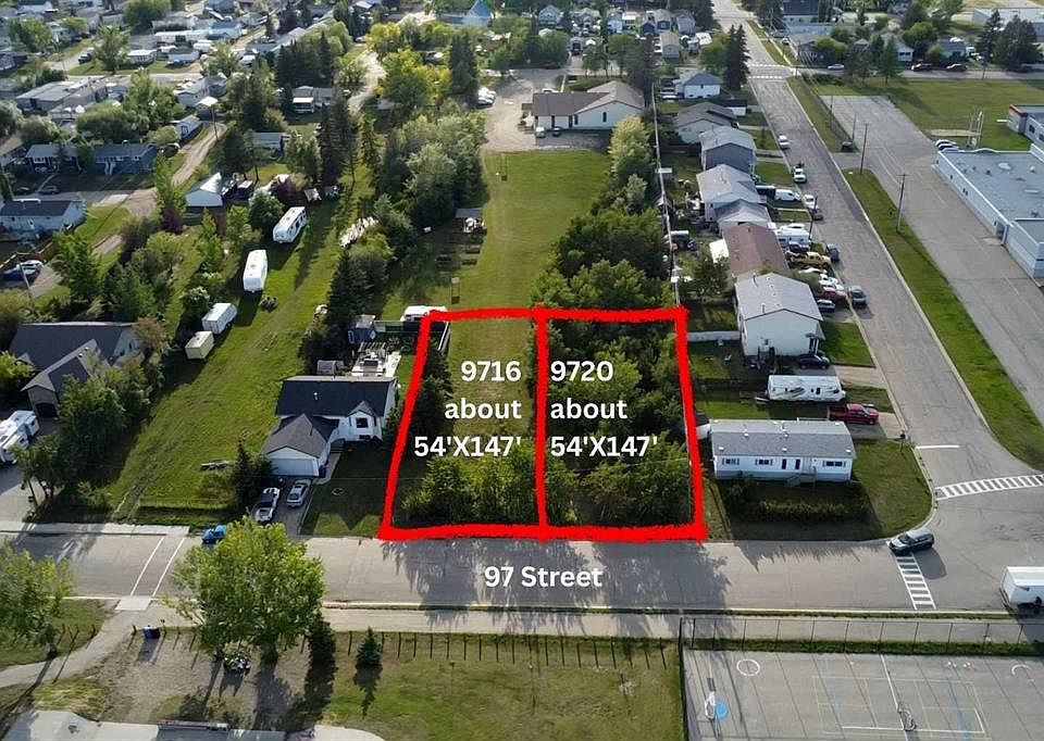 How often do you find two, not one, but two lots side by side? What a great Wembley location, near the schools, parks and playgrounds. 9716 and 9720 on 97 Street are each available. Water and sewer lines are close, right across the street, about $11,000 per lot for connection. Wembley land use bylaw is attached as a supplement so ask your REALTOR® to forward to you. What's your development dream? Work with the town to make your single detached project or perhaps duplex or other low-density multi-unit dwelling take shape! Grande Prairie city residential market is buzzing so overflow options to peaceful places like nearby Wembley are needed for consumers, or yourself. GST may apply per lot.