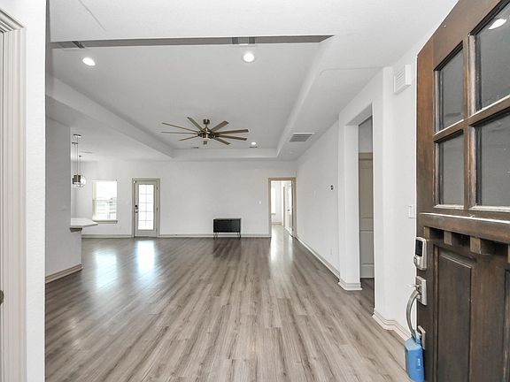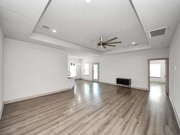 Exceptional 3-bedroom, 2-bath single-story home featuring numerous upgrades and modern finishes throughout. The open-concept layout includes a spacious living, dining, and kitchen area with tray ceilings, recessed lighting, and ceiling fans. The kitchen offers quartz countertops, a large peninsula with seating, pendant lighting, and soft-close cabinets. Enjoy outdoor living on the covered patio deck with recessed lighting and a ceiling fan. The primary suite features a spa-inspired bath with a freestanding soaking tub, dual vanities, glass-enclosed shower, and walk-in closet—plus this home is generator ready.