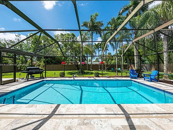 Welcome to this charming home in The Falls area, nestled on a generous 14,800+ SF lot. The expansive backyard, surrounded by lush greenery and elegant palms, is perfect for outdoor living and entertaining. The spacious screened-in patio fully encloses the pool and outdoor area, complete with a built-in grill and summer kitchen. Inside, the kitchen has been fully remodeled with quartz countertops and a large kitchen island. The primary suite offers a large walk-in closet, dual sinks, and direct access to the outdoor patio. The garage has been converted into an in-law suite, making the home larger than the tax roll, and all bathrooms have been remodeled. Completing the home is a large driveway with ample parking for family & guests, all just minutes from the YMCA and the heart of The Falls.