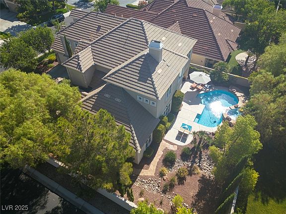 Experience refined living in this elegant 6-bedroom residence, perfectly designed for comfort and sophistication. Step into your own private oasis with a sparkling pool and spa, framed by mature trees, lush landscaping, and vibrant exotic florals. The covered patio and built-in BBQ area create the ideal backdrop for entertaining in style. Inside, discover a versatile floor plan featuring one bedroom on the main level and five upstairs, including a luxurious primary suite with a spacious sitting room. The chef’s kitchen is a true showpiece, showcasing custom cabinetry with designer lighting, double ovens, a center island, premium stainless steel appliances, and gleaming granite countertops. A three-car garage offers built-in cabinetry, a workbench, and a private access door to the backyard. Timeless and sophisticated, this home is nestled within one of Las Vegas’ most prestigious communities.