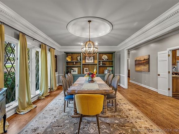 *Stunning Single-Story masterpiece in the heart of South Tulsa within the desirable Hunters Pointe and Jenks School District! Inside, you’ll find beamed and soaring ceilings in the Great Room, Study, and Kitchen, along with stainless appliances and beautiful granite countertops. Canned lights and surround sound throughout the house enhance the modern ambiance. The open floor plan connects the Great Room and Kitchen, perfect for entertaining. The 4-Seasons Sunroom is a serene space filled with natural light and leads to the massive Study includes a wet bar and robust built-in shelving. 3 generously-sized Bedrooms boast new hardwood floors and seamlessly flow to the Primary Bedroom which offers a cozy sitting area with a fireplace, while the private en-suite Bathroom features dual sinks, two walk-in closets, a jetted tub, and separate shower. Outside, a beautifully landscaped Backyard with a covered Patio and outdoor fireplace awaits. The expansive Deck has fresh paint, and an 8-foot decorative privacy fence encloses the expanded yard. Additional features include a mosquito misting system, a whole-house air purifier, and a whole-house generator. Recent upgrades include new interior paint, Family Room wall and fireplace enhancements. This stately home combines style, character, and functionality in one exquisite package. *SB