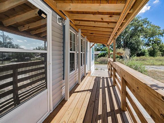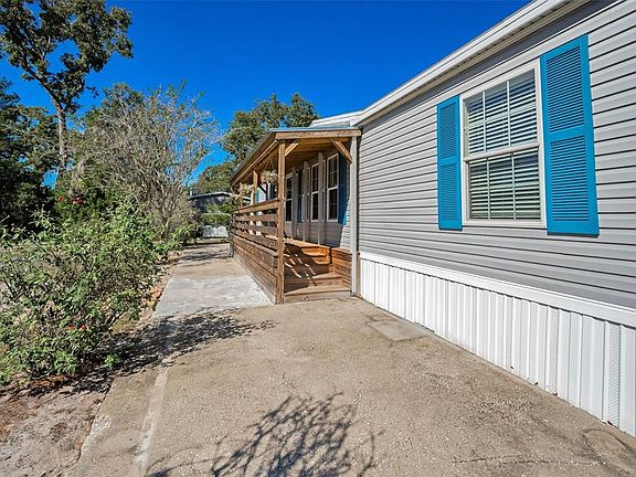 LAND, LARGE LOT ~ NO HOA ~ NO FLOOD INSURANCE ~ HUGE WORKSHOP & GARAGE. Don't miss this affordable 2005 built manufactured home featuring 1566 square feet of heated and air conditioned living space including 3 bedrooms, 2 bathrooms, living room with wood burning fireplace, separate dining room, spacious kitchen, inside laundry room and a detached 875 square foot workshop and garage. Sitting on a .69 acre lot, the newer wood front porch invites you into the spacious living room with newly painted walls, crown molding and a stunning wood burning fireplace with stone accents. The large kitchen is complete with ample cabinets and countertops, plenty of space for a kitchen table or moveable island including beautiful laminate flooring, pass through to the living room, a view of the backyard out the kitchen sink window and easy access to the formal dining room - perfect for entertaining family and friends. The generous in size primary suite is light, bright with a large bathroom including a shower, separate vanities each with a sink, large walk-in closet plus a linen or utility closet and lots of storage cabinets. The secondary bedrooms each have a walk in closet and celing fan with easy acces to the guest bathroom. Additional highlights include newly painted interior walls, inside laundry room including the washer and dryer, newer roof (2021), newer drain fields, HUGE DETACHED WORKSHOP AND GARAGE, partially fenced in yard, sprawling front yard, plenty of room for parking your RV, boat or other toys on this .69-acre lot. This home is ideally located with quick access to schools, shopping, restaurants, medical facilities, parks, Tampa International Airport, the Suncoast Parkway, Florida’s world-famous beaches and more. AFFORDABLE and a MUST SEE HOME.