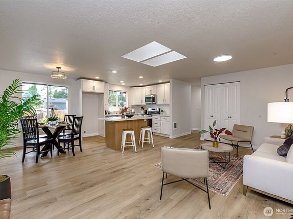 Step inside this stunning home & fall in love with its stylish finishes & functional layout. The spacious living room flows seamlessly into a bright, open kitchen featuring an island, tile backsplash, quartz countertops, & stainless-steel appliances. Main bathroom showcases quartz countertops & a tiled tub/shower surround. The primary suite exudes luxury with a white shaker vanity, quartz countertop, a sleek LED lighted mirror, & a beautifully tiled shower surround accented by champagne bronze fixtures. Downstairs, the versatile lower level has a stylish dry bar with a beverage cooler, picket-tile backsplash, & floating shelves. Fully fenced backyard. 2-car garage. Located just minutes from schools, parks, shopping, & easy freeway access.