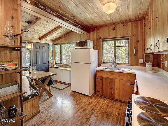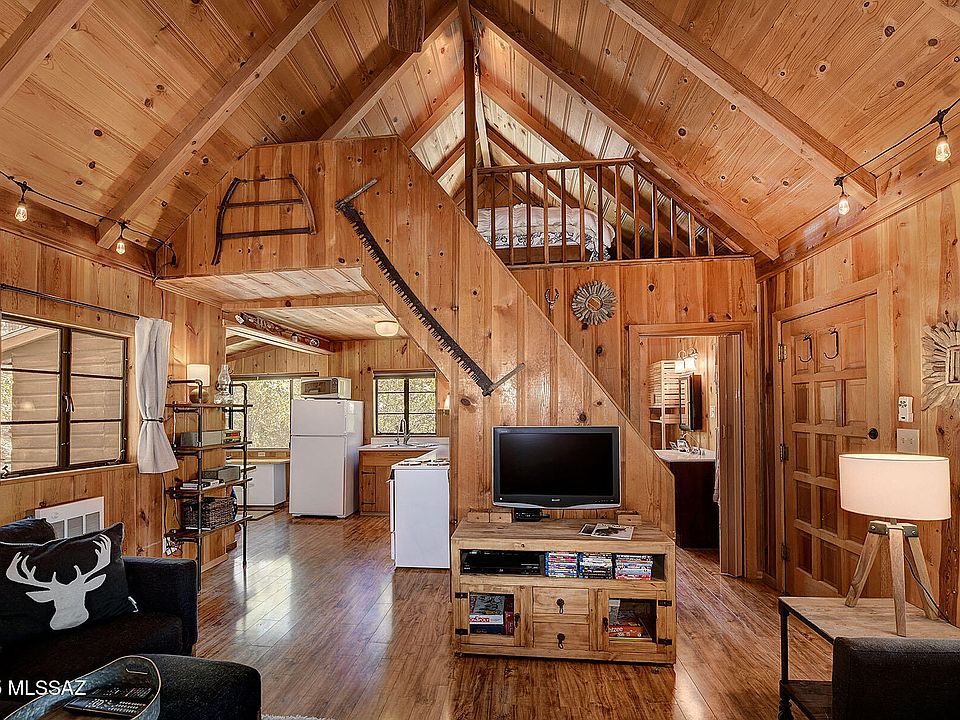 Escape to this beautifully preserved and thoughtfully updated Cabin nestled amongoaks and pines in Willow Canyon--just 16 miles up Mount Lemmon Highway. At approximately 7,000 feet in elevation, this secluded retreat offers cool mountain air and a tranquil connection to nature. The cabin features an open-concept design with vaulted ceilings and a sleeping loft, creating a warm and spacious atmosphere. Inside, you'll find old-growth knotty pine interior walls, handcrafted kitchen cabinetry, and laminate barn board flooring thatenhance the cabin's timeless charm. The fully equipped kitchen includes a built-incustom booth and Acacia wood shelving, while the cozy living area centers around an updated fireplace with high-effiency wood-burning insert and blower. Modern comforts include a hardwired wall heater, portable and window A/C units, and updated 125-
