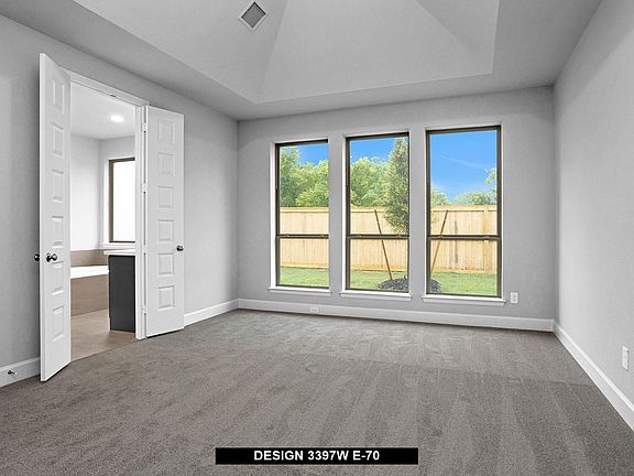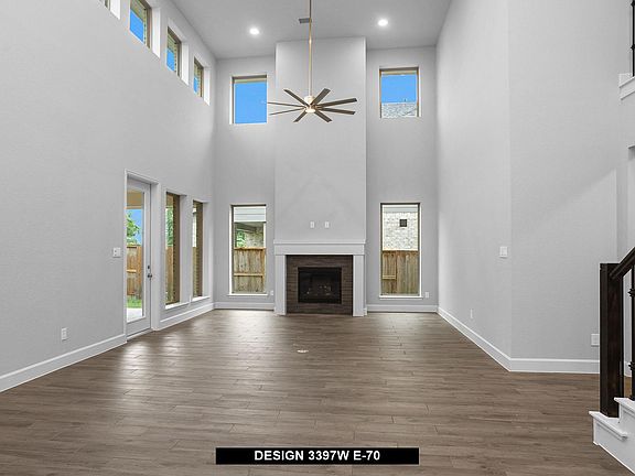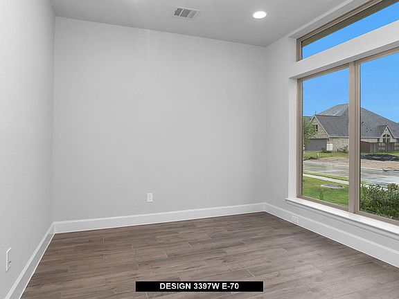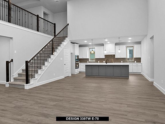 Home office and media room both with French doors frame the two-story entryway. A private guest suite is off of the main hallway and features a full bathroom. The family room with a wood mantel fireplace and dining area connect for an open concept living space. The kitchen features an island with built-in seating and a walk-in pantry. The primary bedroom boasts three large windows. The primary bathroom has dual vanities, a garden tub, a separate glass enclosed shower, and two walk-in closets. Upstairs you are greeted by a large game room that overlooks the first floor. Secondary bedrooms featuring walk-in closets, linen closets, and full bathrooms complete the second level. Extended covered backyard patio. The utility room and mud room are off of the three-car garage.